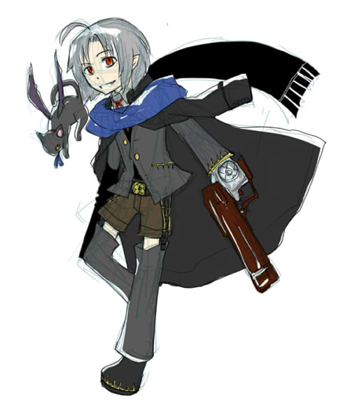 レインさんはまあ、夜モードってことで…常にコートとフード状態では面白みがありませんから…。短パン装備は自分の趣味です。ショタには生足だろう! と。でも、色塗ってから説明文読み返すと黒髪なんですよね…。イメージでは銀髪でした…。そして銃が描けない事実が浮き彫りです…。