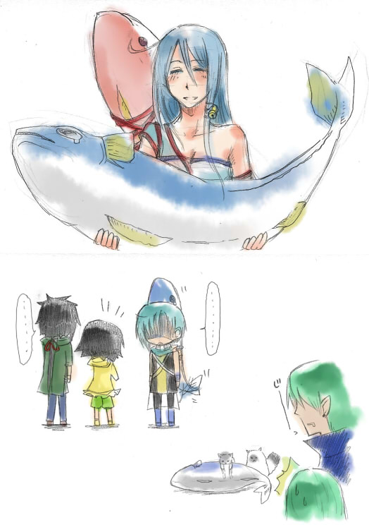 絵はレディさん、朔さん、あおいちゃん、ミルドさん、メルさん、シルヴィさん、まやちゃん。まやちゃんと一緒に、地味にメネスも魚に取り付いてます。