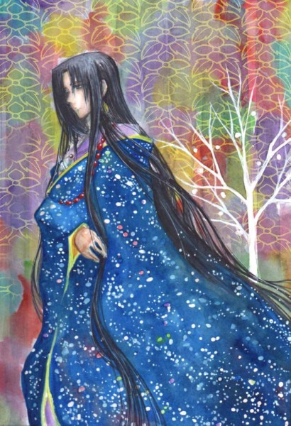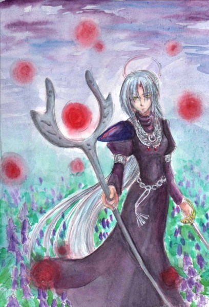ついでにこれは同時進行で描いていた月の神。背景の花はシラネアオイ。花言葉は「完全な美」です。すさまじい自意識ですね。