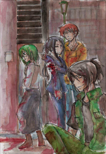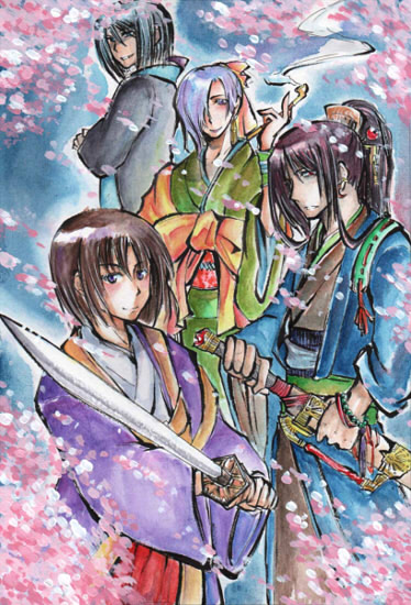 にしてもこうやって見ると紫(真ん中の人)が白髪に見えます…。一応髪の毛は薄色なんですけど、周りが青っぽ過ぎたかなあ。