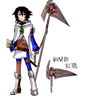 武器:主軸が身の丈ほどある戦闘鉤、サイドに小太刀・投剣など武器四次元ポケットを持つ