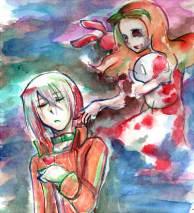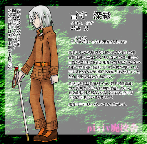 「弟が心配性でね、昼に散歩もさせてくれないんだ。いっつも玄関見張ってるんだよ~」と喋る人は夜の廃校舎に居る。昼に見張りたてる人間が、夜に外出を許すのか? 気付かないことなんてあるのか? という疑問と、深緑には生者と死者の区別がつかない、という特徴からの連想で、行動ではなくそのもの『本当に恐い人間』みたいのを作りたかったなあ、と。