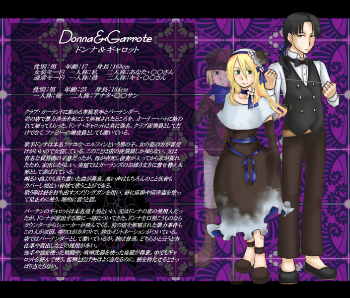 サングエファミリー所属、勢力化にある酒場クラブ・ガーランドの歌姫ドンナとバーテンのギャロット。
