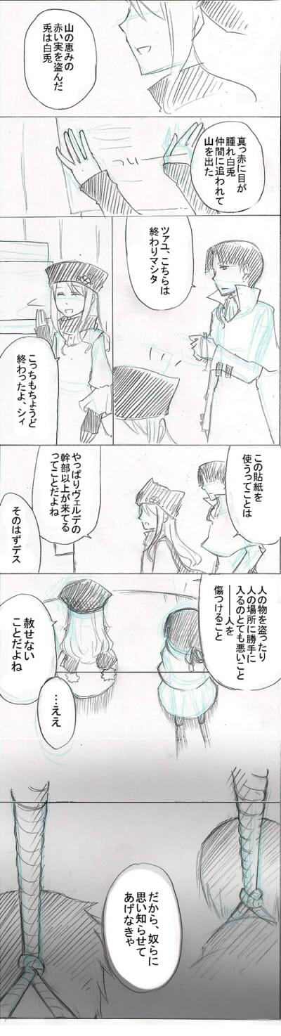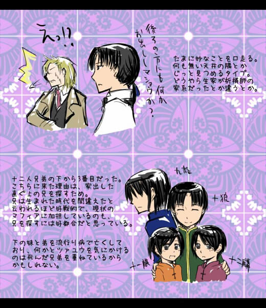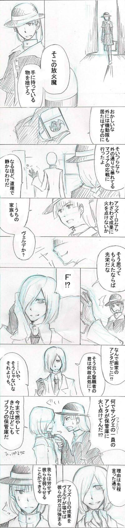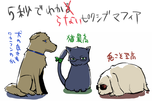 最初にサングエの女性構成員がうさ耳付け出して、対抗してヴェルデは猫耳付け出したからそれぞれのボスを擬獣化してみたもの。警察が犬なのはまあお約束。