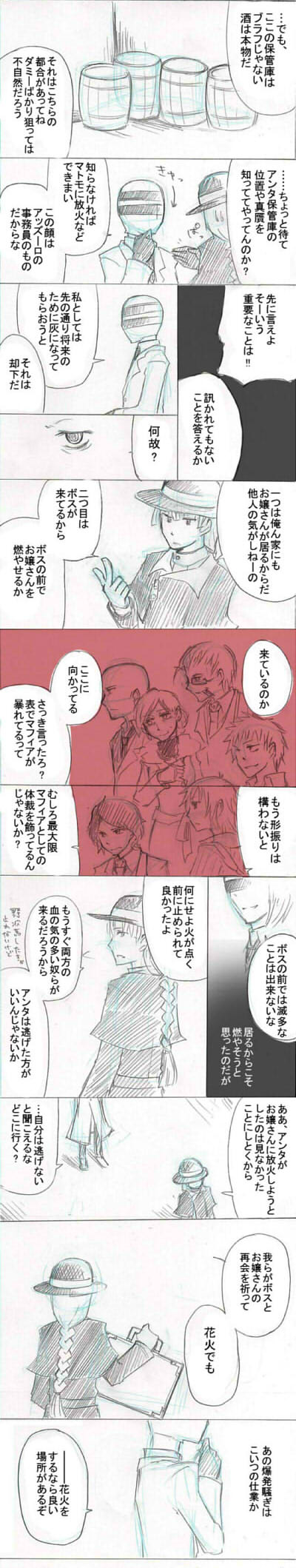 流れとしては、盗まれた酒樽が何者かに次々放火されているから止めに来たという感じです。記事タイトルは放火を発案した方の作品名『fire』からもじっていただきました。